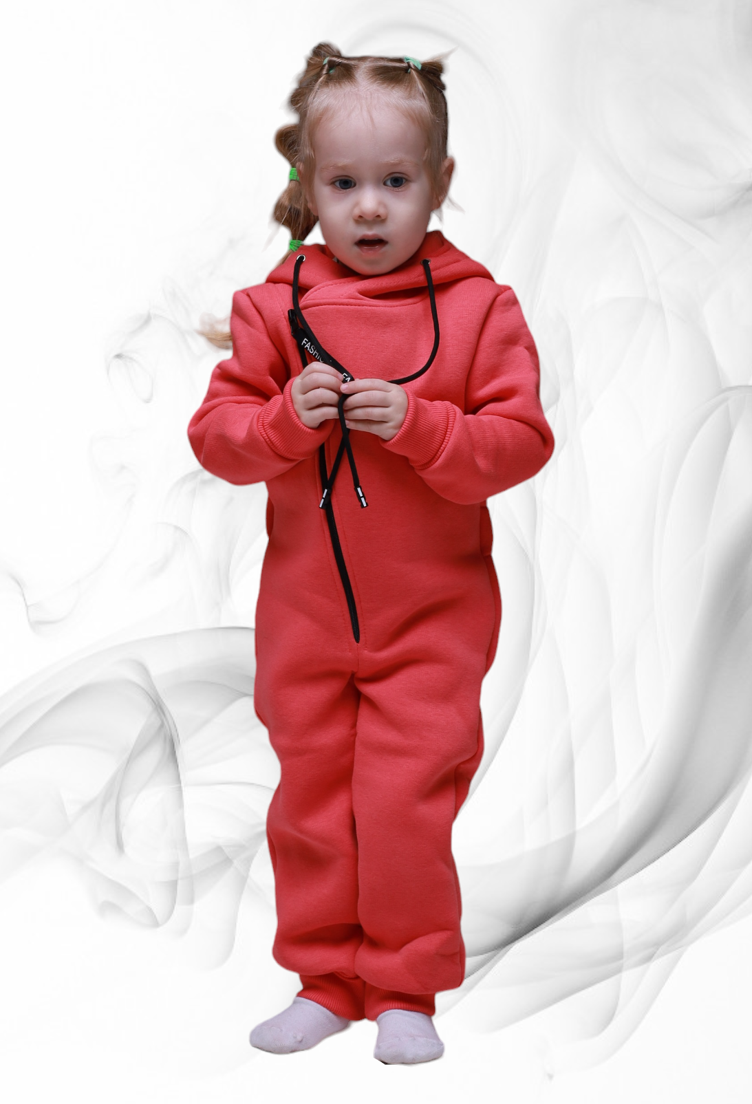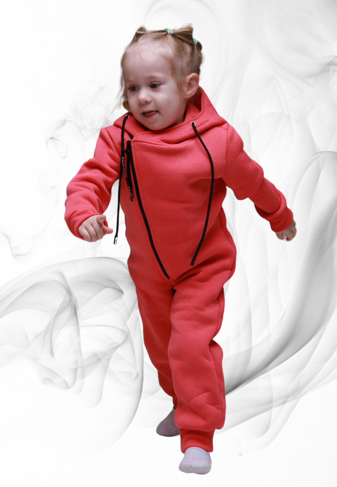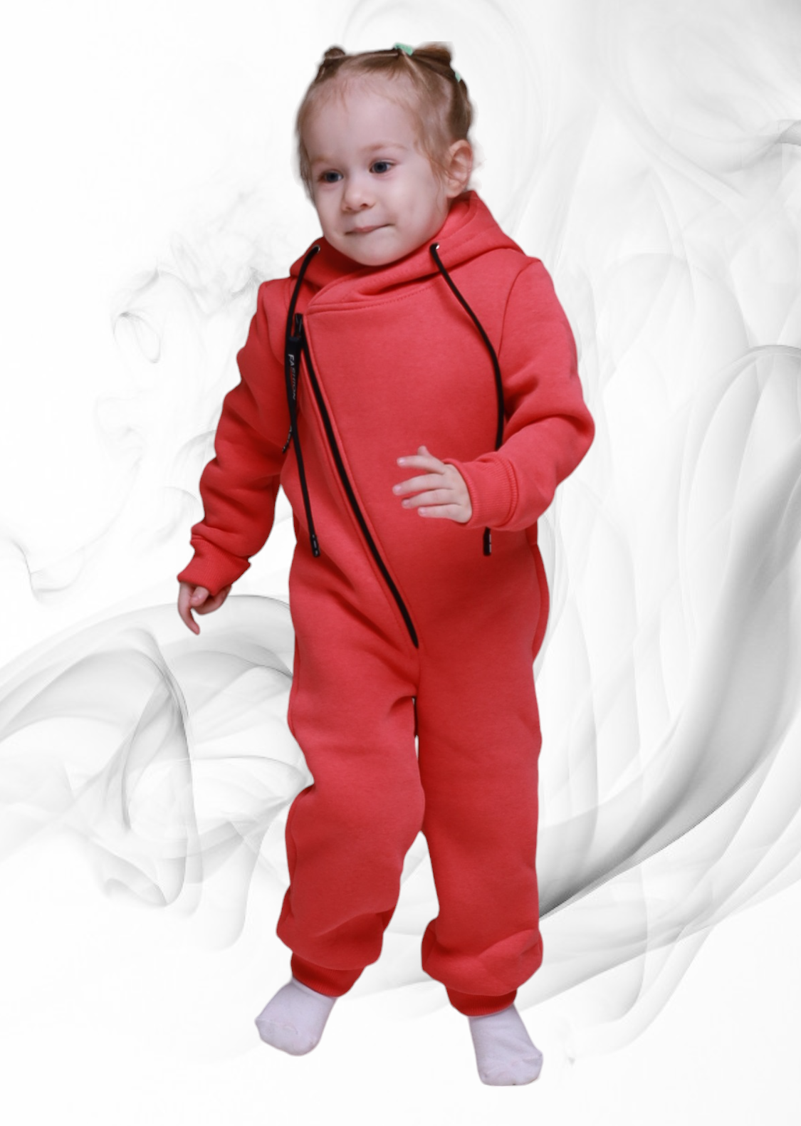 Комбинезон с капюшоном на подкладке, с открытыми ножками, рукавчики на манжете, спереди на косой молнии.