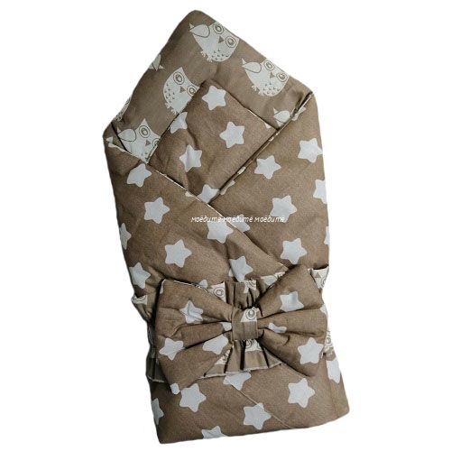 Одеяло выполнено из ткани с двумя разными рисунками, размер 100*100 см. Одеяло можно использовать для укутывания новорождённого, воспользовавшись для закрепления бантом на резинке, который идёт в комплекте.